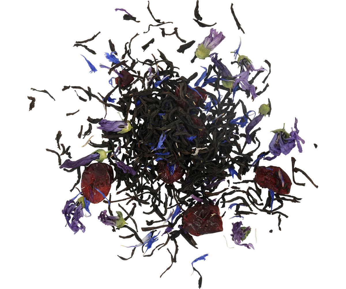 Sammensætning: Sort te 88,9%, tranebærfrugt 6%, kornblomst 0,6%, blå malveblomst 1,5%, aroma (jordbær, abrikos, ananas, papaya)